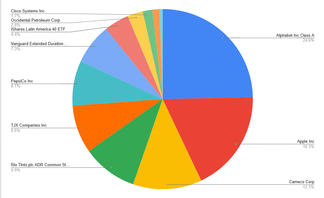 前回のポートフォリオ公開が2025年8月なのですが、その時と比べて、AppleとGoogleの評価額が逆転しています。バフェットがGoogleを購入したのが大きかったですね(引退したはずだけれど)。